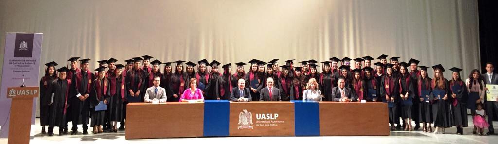 En ceremonia realizada en el Teatro de las Artes del Municipio, y que estuvo presidida por el rector de la UASLP maestro Manuel Fermín Villar Rubio; el director del Campus ingeniero Carlos Francisco Puente Muñiz; la secretaria académica maestra Dolores Lastras Martínez; los pasantes recibieron de las autoridades universitarias su carta de pasante además se titularon por promedio cinco estudiantes quienes obtuvieron calificación igual o mayor a 9.