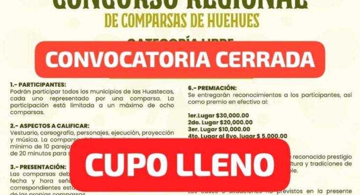 Al superar el límite de comparsas a participar que se estableció en la convocatoria, se estuvieron registrando a los ocho representantes que cubrieron con la totalidad de los trámites requeridos y en cumplimiento a su inscripción formal. El concurso regional de comparsas de huehues se llevará a cabo el día 08 de noviembre, en punto de las 17:00 horas, en los terrenos de la FENAHUAP.