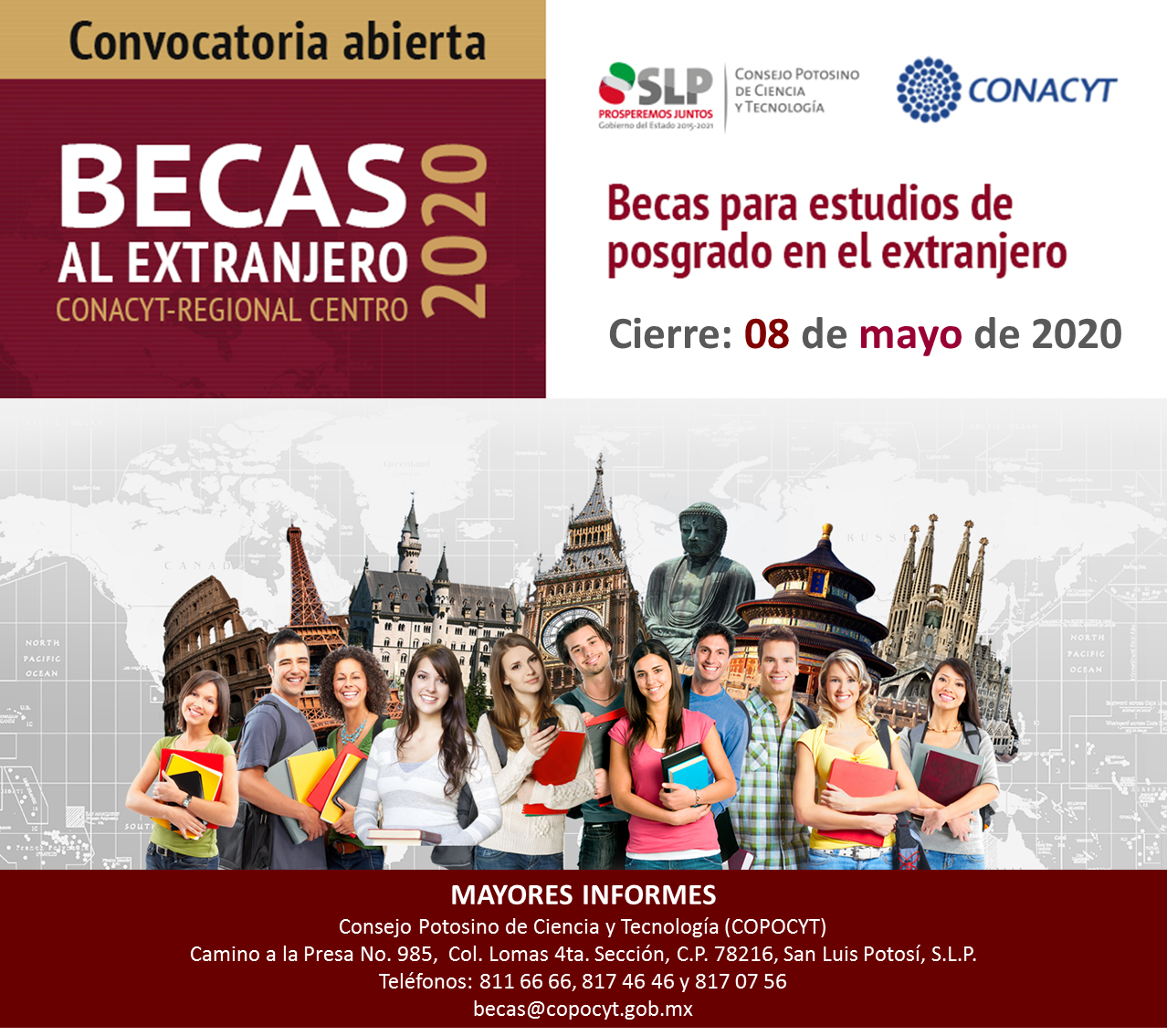 La convocatoria cierra el próximo 08 de mayo de 2020. Para mayores informes, están a disposición los teléfonos 811 66 66, 817 46 46, el correo electrónico becas@copocyt.gob.mx y directo en las oficinas del Consejo ubicadas en Camino a la Presa No. 985, Col. Lomas 4ta.