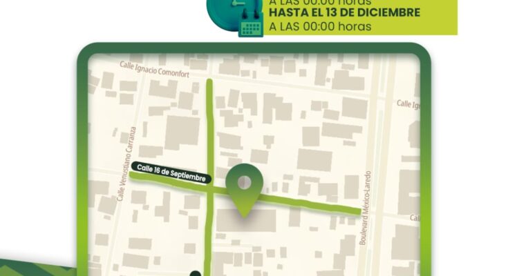 El paso vehicular permanecerá cerrado en los siguientes tramos: calle 16 de Septiembre, a partir del bulevar México-Laredo hasta el cruce con la calle Carranza; así como en la calle Galeana, entre calles Escontria y Comonfort. Se recomienda a los automovilistas tomar previsiones y utilizar rutas alternas, ya que el cierre iniciará a las 00:00 horas del jueves 11 de diciembre.