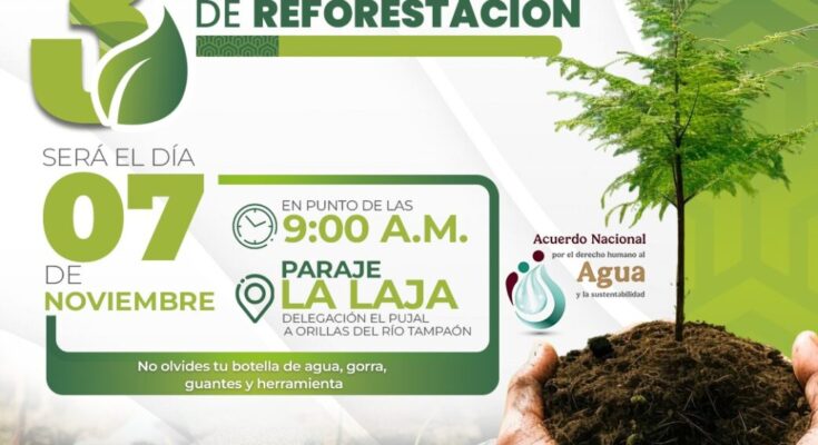 CIUDAD VALLES, S.L.P.- La Dirección de Ecología Municipal, que dirige Julio Cesar Otero Torres, en coordinación con la Comisión Nacional del Agua, invitan a la Tercera Etapa de Reforestación que se estará llevando a cabo el día viernes 7 de noviembre, en el Paraje La Laja, correspondiente a la Delegación de El Pujal.
