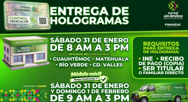 Con el cambio que se vive y se siente en la administración Estatal y para apoyar a las y los potosinos en la obtención del holograma 2026, este sábado 31 de enero se ampliará la atención en oficinas recaudadoras de Cuauhtémoc, Matehuala, Rioverde y Ciudad Valles, de 8:00 a 15:00 horas, exclusivamente para la entrega de hologramas a quienes realizaron su pago por medios electrónicos o bancarios.