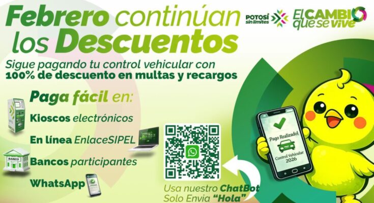 El Gobierno del Estado encabezado por Ricardo Gallardo Cardona, anunció la ampliación durante todo el mes de febrero del programa de descuento del 100 por ciento en multas y recargos de control vehicular, con el objetivo de facilitar el cumplimiento de las obligaciones fiscales y apoyar la economía de las y los contribuyentes, como parte del cambio que se vive y se siente en San Luis Potosí.