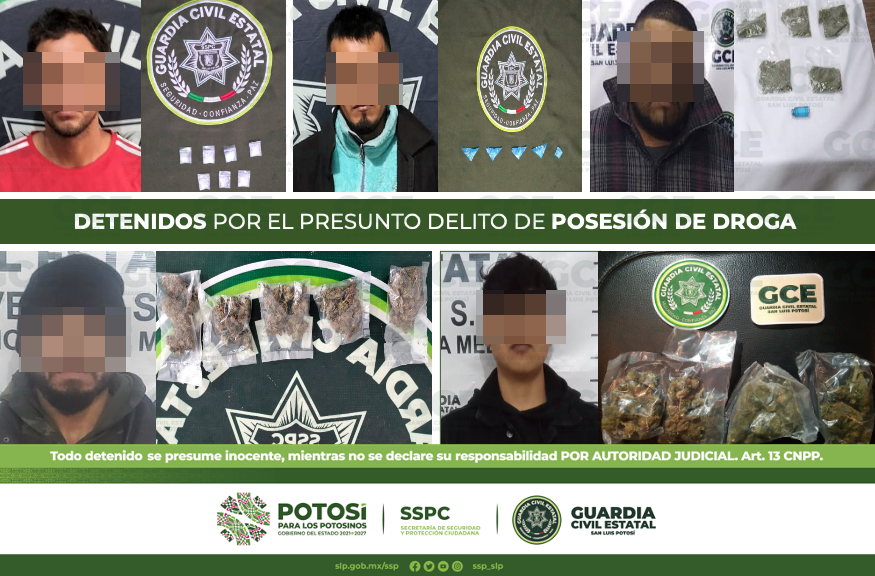 En la ciudad capital fueron detenidas cinco personas, mientras que, en el municipio de Soledad de Graciano Sánchez, un masculino. En el primer hecho, los elementos de la GCE detuvieron a Emilio de 19 años de edad, con 6 dosis de “cristal”; sobre la colonia Del Llano, César de 21 años fue detenido, al asegurarle dos dosis de marihuana y una bicicleta de su propiedad; a su vez, en la colonia Prados Segunda Sección, fue detenido José de 22 años, con cuatro dosis de “cristal”.