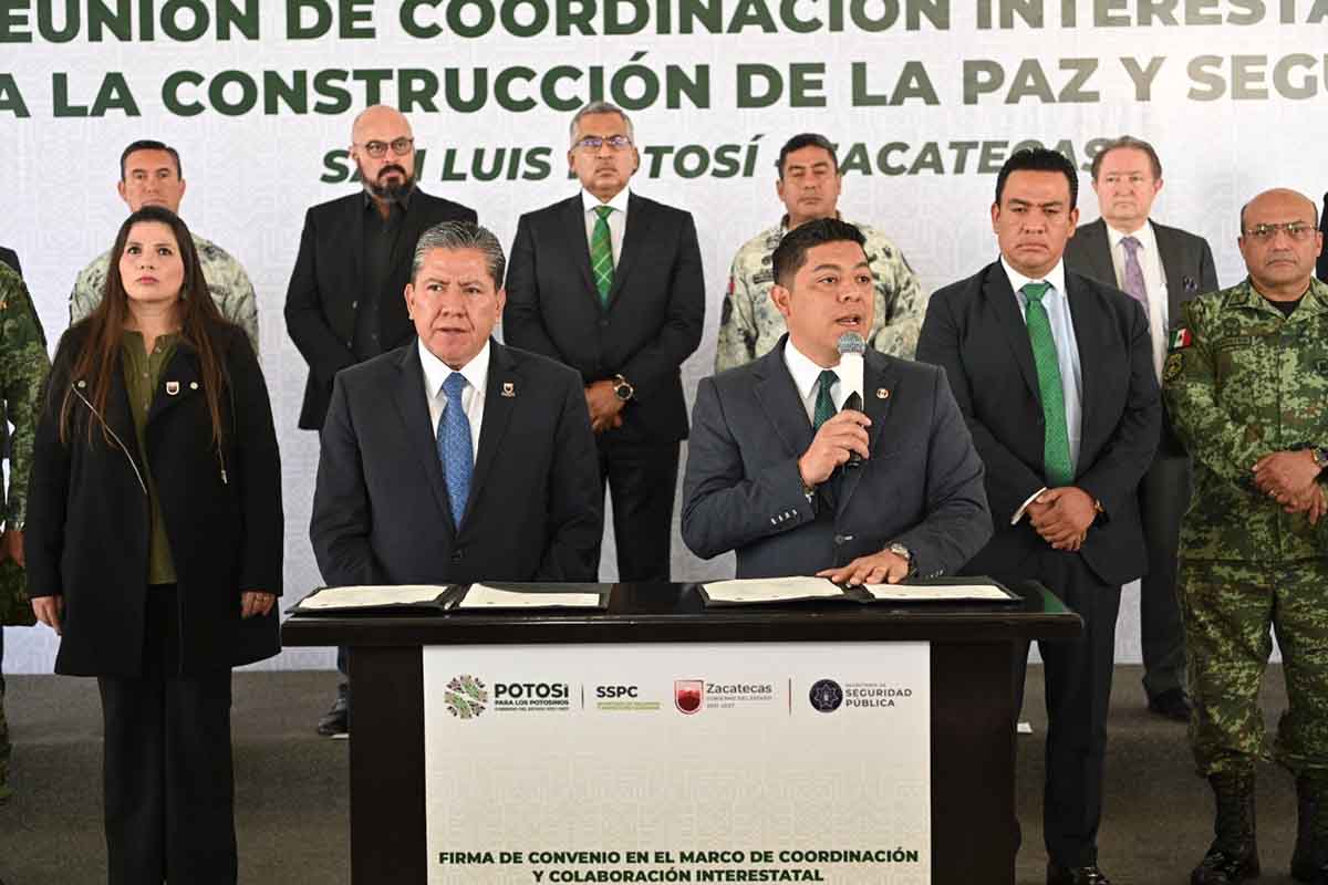 Sobre el convenio marco de Coordinación y Colaboración Interestatal para la Construcción de la Paz y Seguridad San Luis Potosí–Zacatecas, el Jefe del Ejecutivo potosino especificó que el número de elementos en los límites de las dos entidades, aumentará con agentes que se tienen listos para todo el Estado, aquellos que están en formación en la Academia y la convocatoria próxima para 300 cadetes más, aunado a la incorporación próxima de la Guardia Civil de Caminos.