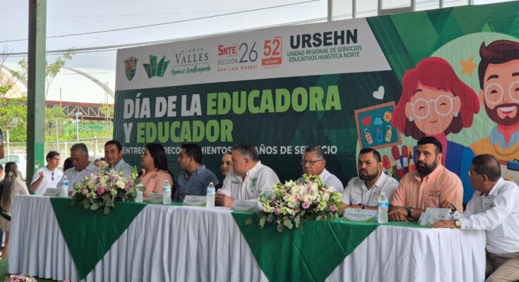 CIUDAD VALLES. S.L.P.- El Presidente Municipal David Armando Medina Salazar, acompañado de su esposa y Presidenta del Sistema Municipal DIF, Ena Avendaño Uscanga, encabezó el festejo con motivo del Día de la Educadora y del Educador, reconociendo el compromiso, vocación y entrega de quienes dedican su vida a la formación de la primera infancia.