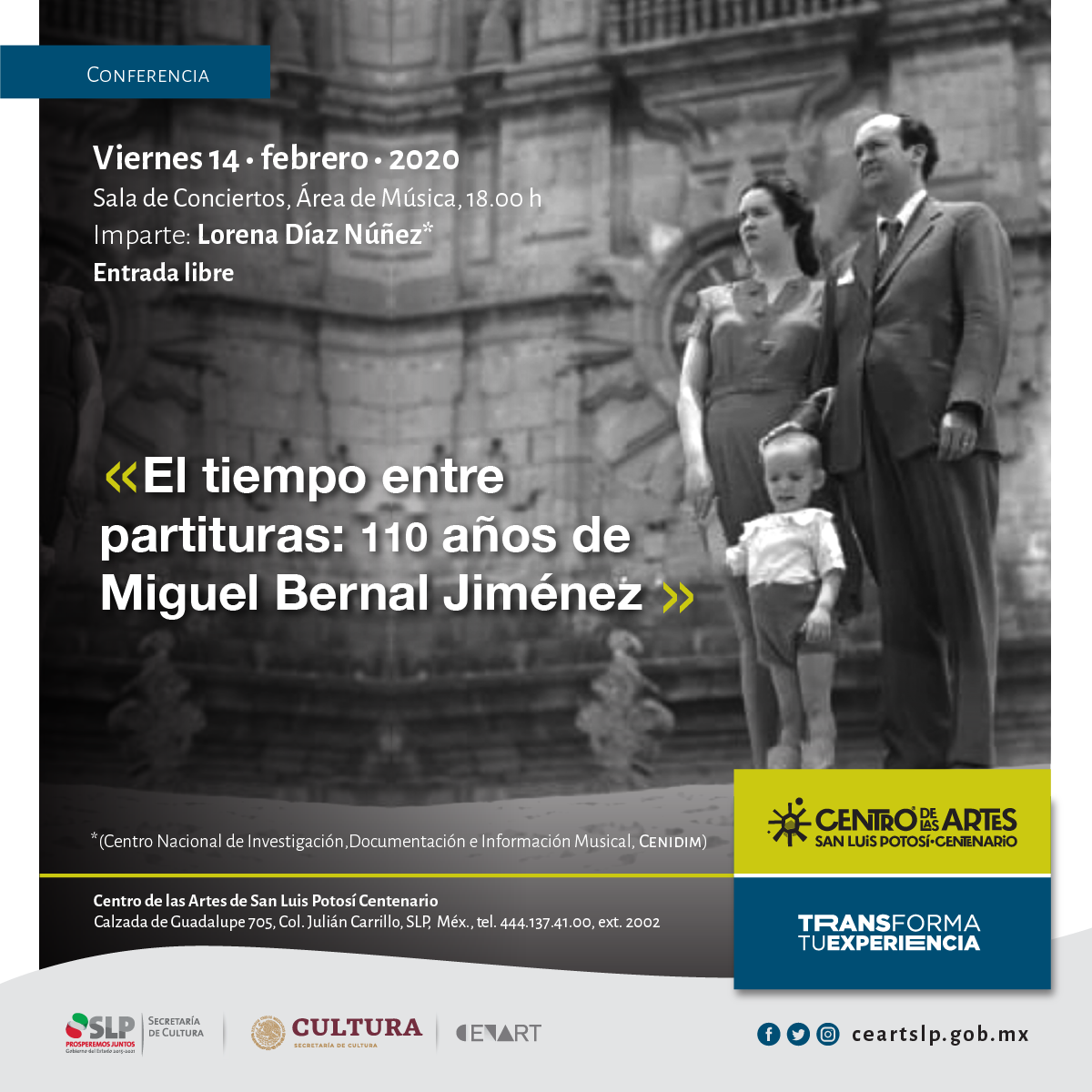 San Luis Potosí.- El próximo viernes 14 de febrero se llevará a cabo la conferencia “El tiempo entre partituras: 110 años de Miguel Bernal Jiménez”, que será impartida por la investigadora Lorena Díaz Núñez del Centro Nacional de Investigación, Documentación e Información Musical (CENIDIM), en el área de Música del Centro de las Artes de San Luis Potosí Centenario, como parte de sus actividades complementarias al programa académico vigente, y en conmemoración al natalicio de este compositor mexicano.