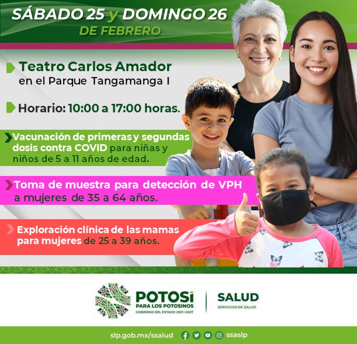 De 10:00 a 17:00 horas en la explanada del Teatro Carlos Amador ubicado al interior del Parque Tangamanga I, se estará aplicando Pfizer pediátrica a niñas y niños de 5 a 11 años, quienes deben acudir en compañía de una persona adulta, presentar hoja de registro del portal https://mivacuna.salud.gob, CURP actualizada y si es para segunda dosis, presentar comprobante de la primera aplicación.