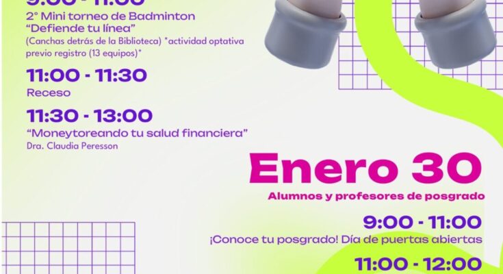 El programa contempla diversas pláticas y talleres, entre ellos “La proactividad es la esencia para mejorar mi vida”, impartida por el MC. Octavio Leyva Ramos el martes 27 de enero, de 9:00 a 10:30 horas; la charla “Gestión estratégica del tiempo para la productividad en investigación”, a cargo de la MC. Verónica Rueda, el miércoles 28 de enero, de 10:30 a 12:30 horas; así como la plática orientada a la salud financiera “Moneytoreando tu salud financiera”, impartida por la doctora Claudia Peresson, a las 11:30 horas, en las instalaciones del plantel.