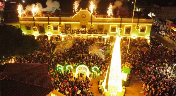 CIUDAD VALLES, S.L.P. – El Presidente Municipal David Armando Medina Salazar, en compañía de su esposa y Presidenta del Sistema Municipal DIF, Ena Avendaño Uscanga, y de su hija María Fernanda Medina Avendaño, realizó la noche de este viernes el encendido del pino navideño ante la presencia de miles de familias que se reunieron en la plaza principal.