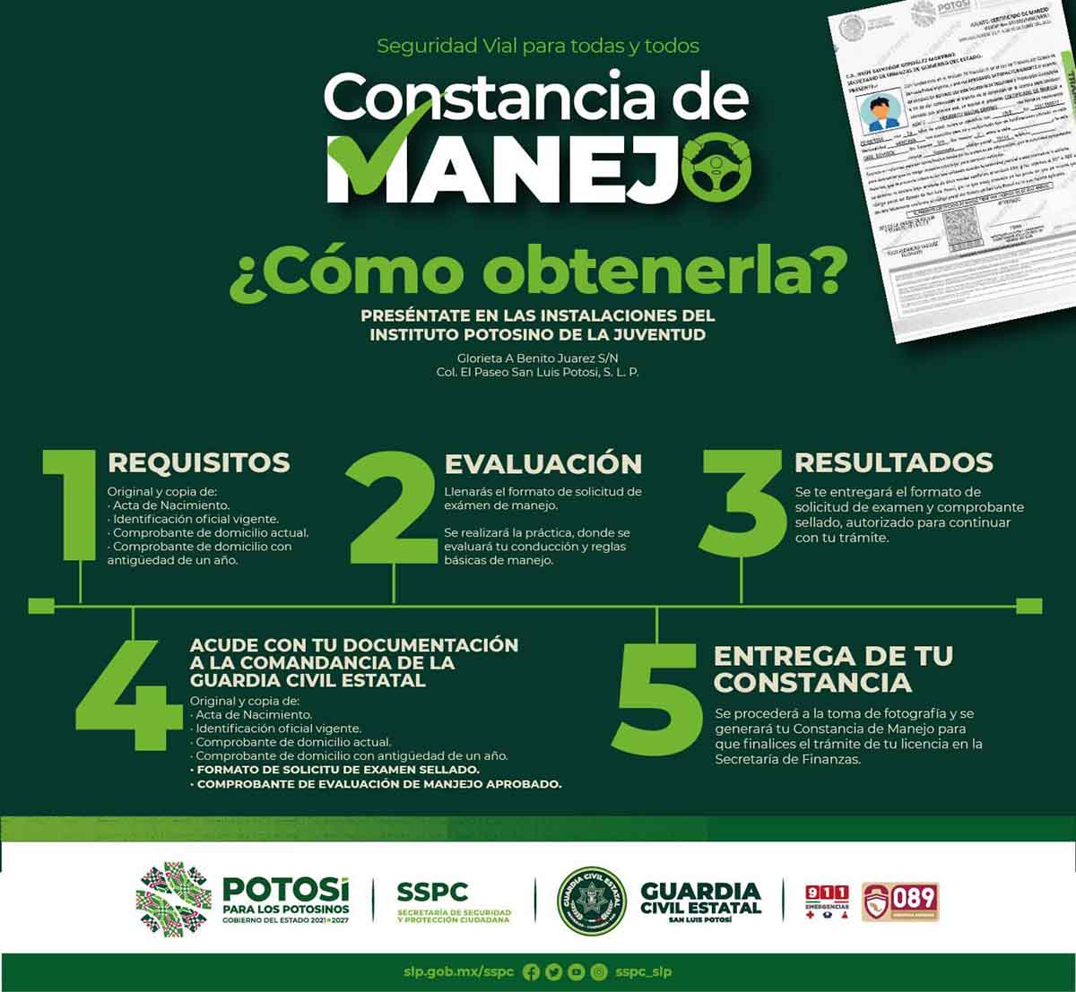 De manera inicial, la Constancia de Manejo se aplicará de manera gratuita a interesados en tramitar su licencia de conducir por primera vez de la zona metropolitana, posteriormente a municipios con mayor número de población y movilidad vial, como Matehuala, Rioverde, Ciudad Valles y Tamazunchale.