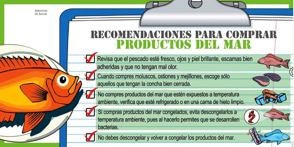 • Que estén frescos para evitar alguna enfermedad gastrointestinal por lo que solo se debe adquirir aquel pescado que presenta los ojos húmedos, brillantes y cristalinos, que su piel está firme, con brillo y las escamas bien adheridas y su olor sea a mar por lo que respecta a ostiones, almejas o mejillones hay que adquirir y consumir aquellos que tengan la concha firmemente cerrada.