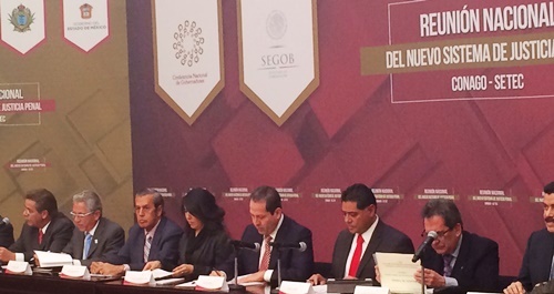 México D.F.- Luego de la reunión de la Comisión de Asuntos Internacionales los mandatarios estatales, miembros de la Conferencia Nacional de Gobernadores (CONAGO) participaron en la reunión Nacional del Nuevo Sistema de Justicia Penal, donde se analizaron los avances que las entidades federativas tienen en relación a la implementación de este Sistema.