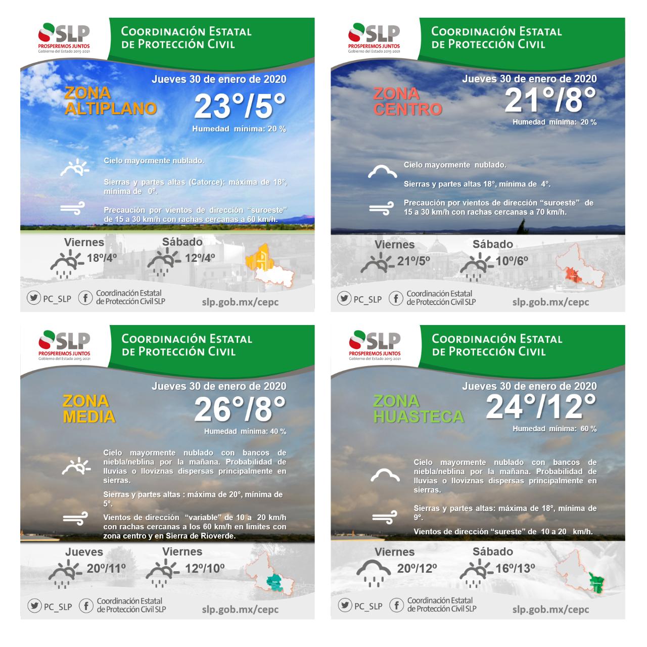 San Luis Potosí.- De acuerdo al pronóstico del Servicio Meteorológico Nacional (SMN), se prevén vientos de 20 a 30 kilómetros por hora con rachas que podrían llegar a los 70 kilómetros por hora para las zonas Centro, Altiplano y Media, informó la Coordinación Estatal de Protección Civil.