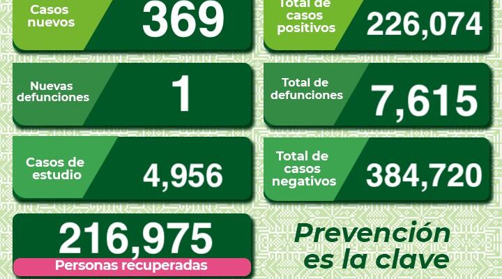 En el Estado, se han confirmado 369 nuevos contagios de Covid-19, sumando hasta este 21 de agosto 226 mil 074 casos totales del virus, por lo que el Comité Estatal para la Seguridad en Salud y los Servicios de Salud reiteran a la ciudadanía seguir aplicando las medidas de prevención.