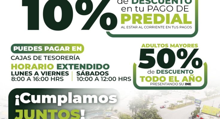 CIUDAD VALLES, S.L.P.- La Tesorería Municipal hace un llamado a las y los contribuyentes para que continúen aprovechando el descuento en el pago de impuesto predial correspondiente al ejercicio 2026, pues durante el mes de febrero se estará aplicando el 10 por ciento. De igual manera, se invita a las y los ciudadanos para que se acerquen a regularizar adeudos y se mantengan al corriente con sus pagos.
